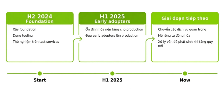 • H1 2025: hoàn thiện nền tảng để sẵn sàng cho production và đưa nhóm service đầu tiên lên production
