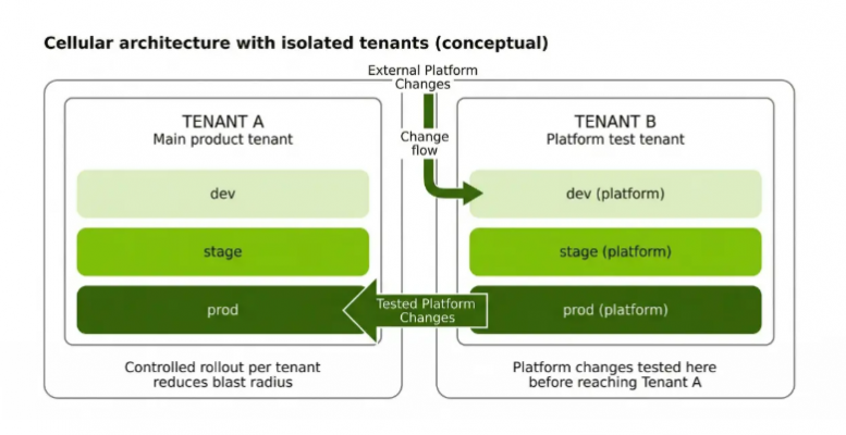 Duolingo triển khai mô hình tenant/cell, trong đó mỗi tenant là một môi trường tách biệt và bao gồm các lớp dev, stage, prod. Các thay đổi ở tầng nền tảng được thử nghiệm trước trong một tenant riêng, rồi mới áp dụng vào tenant chính của các nhóm dịch vụ. Mục tiêu của cách triển khai này là đưa thay đổi vào phạm vi nhỏ trước, giới hạn blast radius và giảm rủi ro lan rộng khi có lỗi hoặc hành vi ngoài dự kiến.