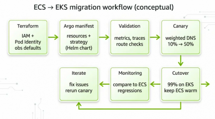 Một mốc triển khai quan trọng là mọi service mới đều phải chạy trên EKS ngay từ đầu, nhằm tránh làm tăng thêm khối lượng chuyển đổi còn lại và ngăn quy mô workload trên ECS tiếp tục phình ra.